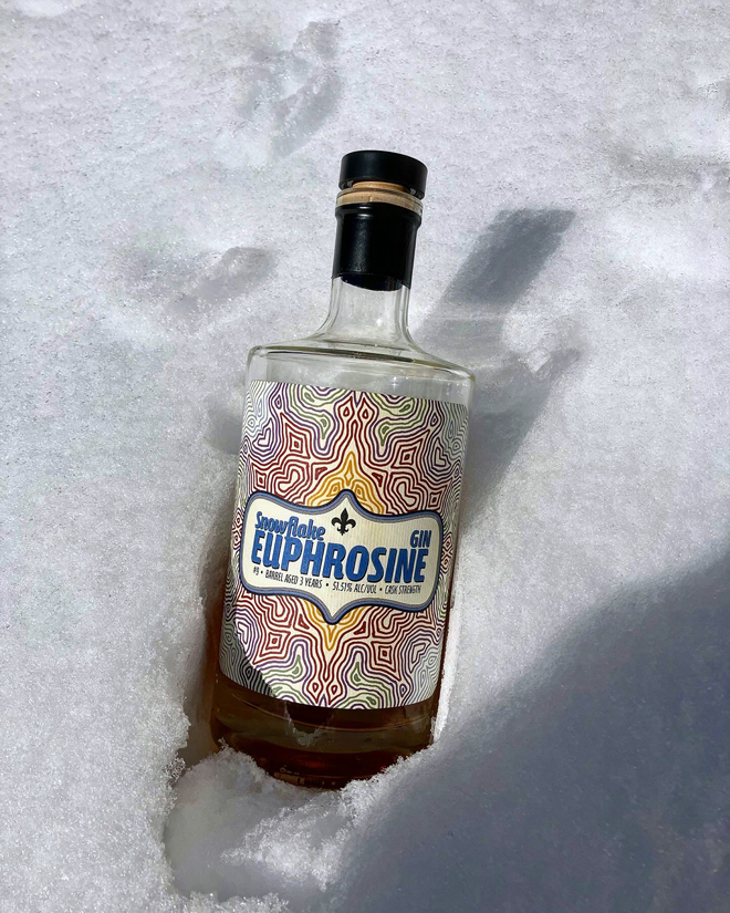 One such special release is our Euphrosine Gin #9 Snowflake Edition. The Snowflake was aged in oak for over three years; and also rested in stainless for over six years. The distillate is over ten years old.